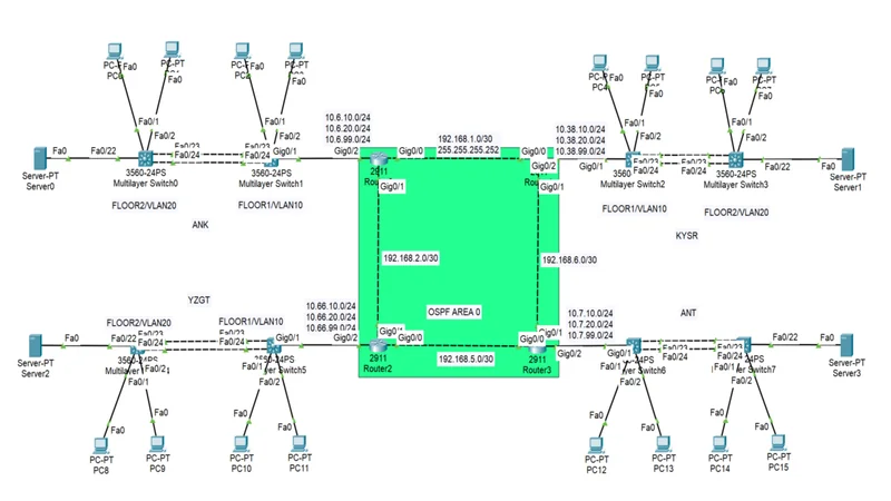 4 şubeli bir finans kurumu için; Zero Trust güvenlik politikaları, Router-on-a-Stick (ROAS) mimarisi, OSPF omurga yönlendirmesi ve LACP yedekliliği ile uçtan uca tasarılanmış kurumsal ağ modernizasyonu projesi.